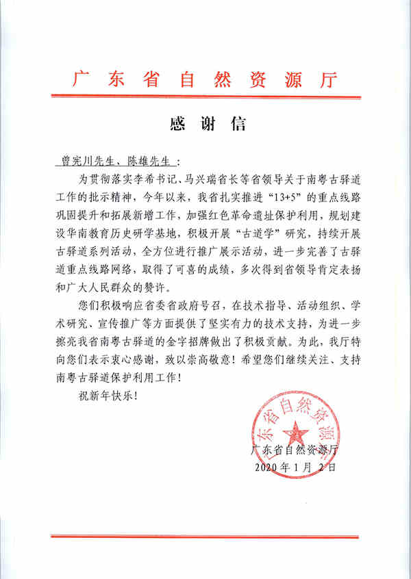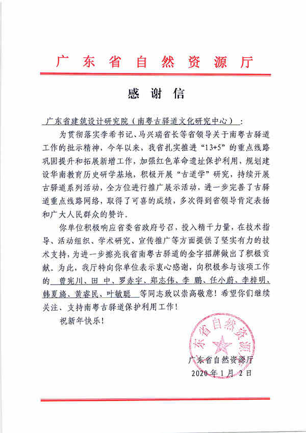 2019年,我省南粵古驛道活化行動在構(gòu)建華南教育歷史研學(xué)基地的高潮中取得新突破,我院在南粵古驛道技術(shù)指導(dǎo)、規(guī)劃設(shè)計、活動組織、學(xué)術(shù)研究、宣傳推廣等方面做出了積極貢獻,獲得省自然資源廳書面感謝。黨委書記曾憲川、副院長陳雄、總工程師羅赤宇等人也獲得表揚。