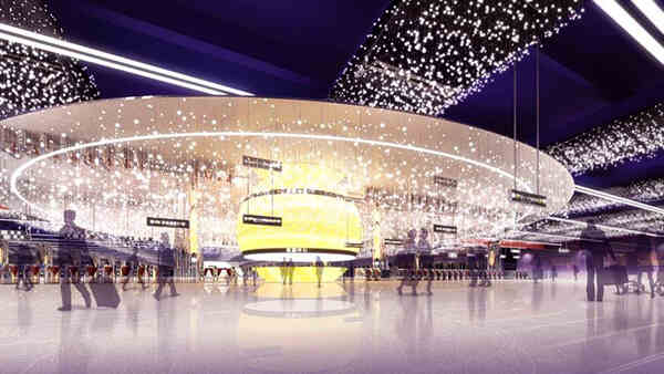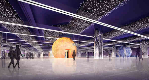 星球5:通過(guò)大量不銹鋼垂直構(gòu)件組合排列形成球面吊掛于站廳閘機(jī)上方天花處,并用藍(lán)色射燈照射,形成藍(lán)色星云的意境。