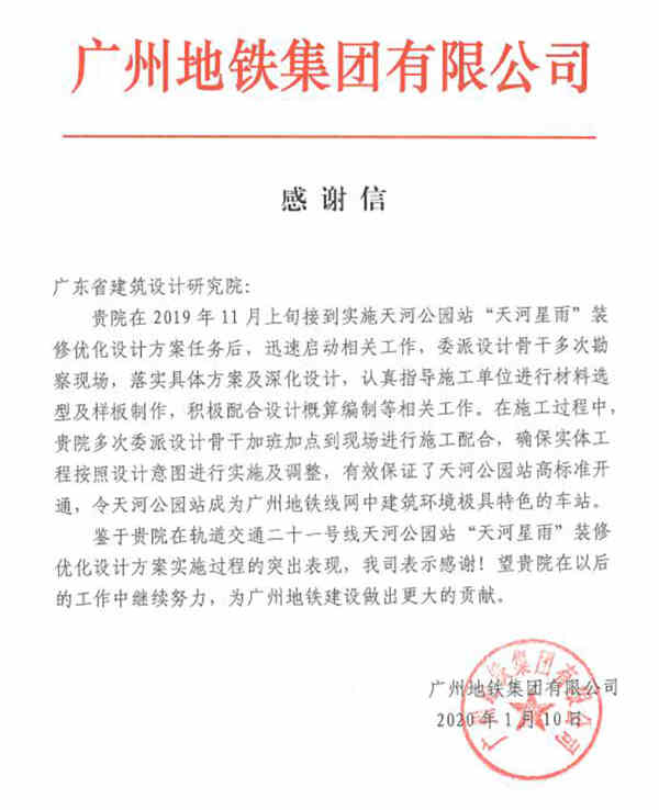 2019年12月20日,廣州地鐵二十一號(hào)線后通段如期開(kāi)通。廣東省建筑設(shè)計(jì)研究院(GDAD)團(tuán)隊(duì)參與了包括全線車站公共區(qū)裝修方案設(shè)計(jì)、4個(gè)高架站與1個(gè)地下站的工點(diǎn)設(shè)計(jì)、1個(gè)地面站的外立面設(shè)計(jì)。其中高架站之一的金坑站成為全國(guó)首例獲得“三星級(jí)綠色建筑設(shè)計(jì)標(biāo)識(shí)證書”車站,亞洲第一大地鐵站——天河公園站裝修優(yōu)化設(shè)計(jì)“天河星雨”更是受到業(yè)界的廣泛關(guān)注和業(yè)主的高度認(rèn)可。