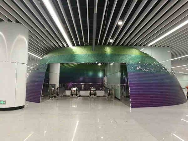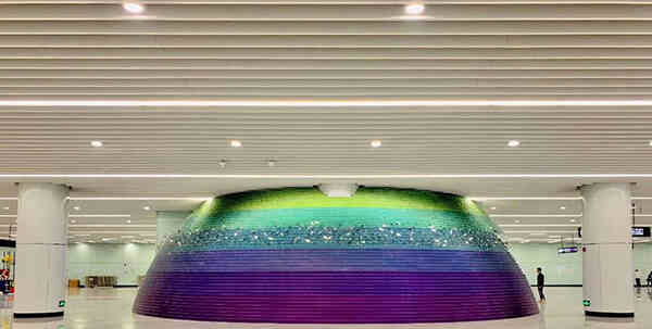 星球2:為突出車站交通核心,在站廳中部下站臺(tái)扶梯與疏散樓梯組合處,設(shè)置通過(guò)層層顏色漸變波紋不銹鋼彎通疊加而成的半球體,穿越球體口部可經(jīng)過(guò)扶梯下達(dá)站臺(tái)。球體表面設(shè)有鏡面不銹鋼“花鳥(niǎo)魚蟲(chóng)”藝術(shù)構(gòu)件,豐富車站的藝術(shù)與想象空間。