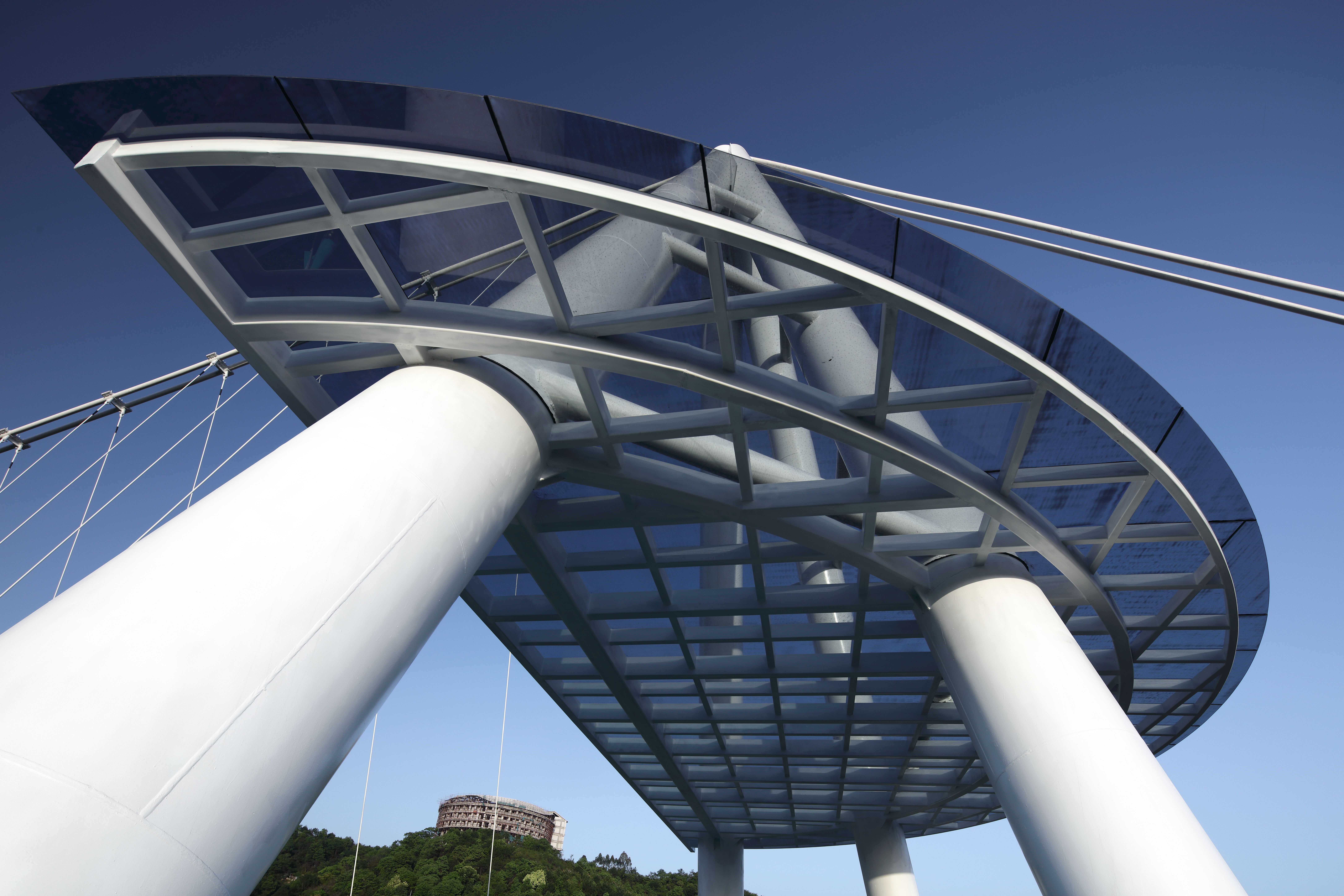 項目通過雙主纜、X形雙拱橋面、剛接支座、合理設(shè)置混凝土阻尼塊、固定主纜、加大橋面預(yù)拱度的措施,做到不設(shè)置抗風(fēng)索、穩(wěn)定索時仍能保證橋梁整體剛度和穩(wěn)定性,為國內(nèi)首創(chuàng)。實現(xiàn)了建筑景觀優(yōu)美、纖細(xì)通透、綠色節(jié)能、環(huán)境友好的創(chuàng)先設(shè)計理念。