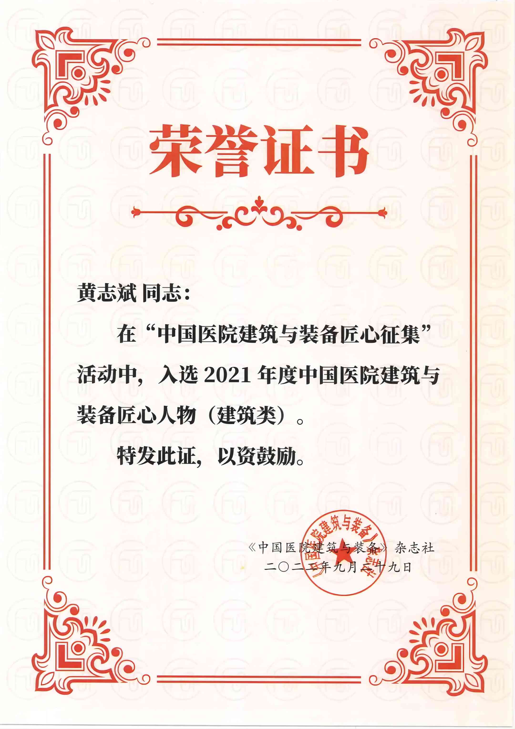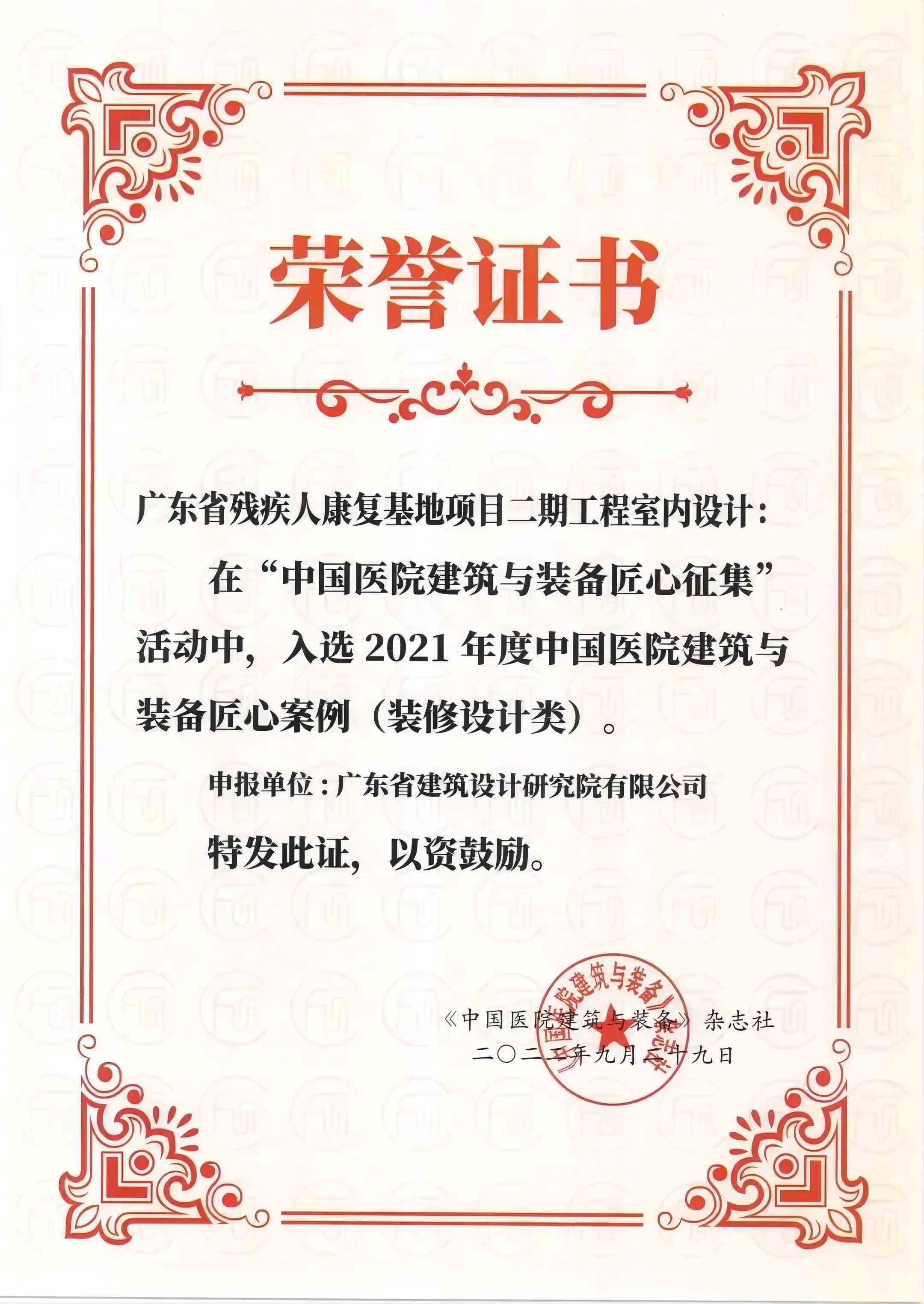 建筑裝修設(shè)計研究所的《廣東省殘疾人康復(fù)基地項(xiàng)目二期工程室內(nèi)設(shè)計》榮獲2021年度中國醫(yī)院建筑與裝備匠心案例,所副總工程師黃志斌榮獲“2021年度中國醫(yī)院建筑與裝備匠心人物獎”。