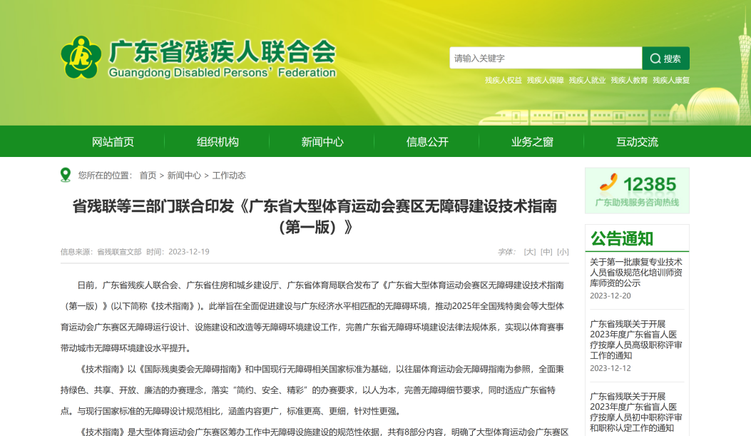 12月19日,公司主編的《廣東省大型體育運(yùn)動(dòng)會(huì)賽區(qū)無(wú)障礙建設(shè)技術(shù)指南(第一版)》(以下簡(jiǎn)稱《技術(shù)指南》)由廣東省殘疾人聯(lián)合會(huì)、廣東省住房和城鄉(xiāng)建設(shè)廳、廣東省體育局聯(lián)合發(fā)布。