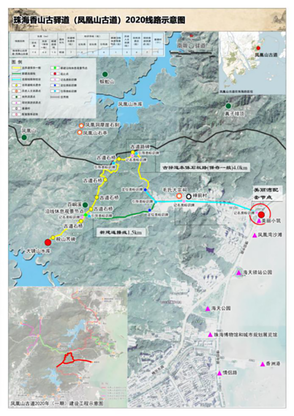 2020年香山古道(珠海鳳凰山段)列入南粵古驛道新增重點(diǎn)線路,年度約束性任務(wù)包括古道本體修復(fù)、連接線建設(shè)、古橋遺存修復(fù)、古驛道標(biāo)識設(shè)施安裝、沿線休息觀景節(jié)點(diǎn)提升等,現(xiàn)正在重點(diǎn)推進(jìn)鳳凰山段一期建設(shè),通過修復(fù)5公里古道本體,以及建設(shè)8.5公里懸空平臺、空中棧道、吊索浮橋等多種形式的古驛道山地連接線,并結(jié)合紅花山森林公園建設(shè),串聯(lián)起沿線歷史文化資源點(diǎn)、公共游憩空間、旅游景點(diǎn)及美麗鄉(xiāng)村,打造鳳凰山歷史文化游徑,構(gòu)建鳳凰山休閑步道,形成珠海山海觀光帶,成為珠海“山、海、城”休閑慢行網(wǎng)絡(luò)體系重要一環(huán)。